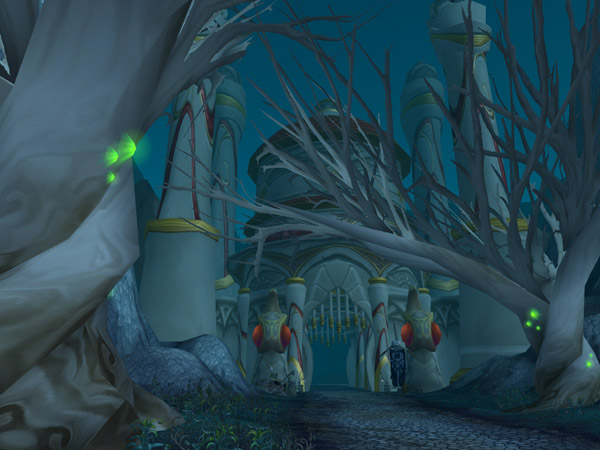 The large gatehouse near the portal is believed to be one of the Elfgates (probably the Outer Elfgate, judging by its proximity to the border) that sealed off Quel'Thalas from Lordaeron. The gates are flanked by Scourge banners - possibly placed when the Scourge snuck through Quel'Thalas' defenses, aided by the traitor Dar'Khan Drathir.