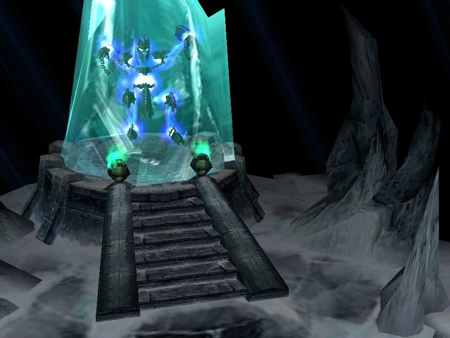 Arthas entered the hollow glacier and beheld a winding pinnacle chained to the ice. As he strode up the stairs towards his destiny, the voices of those he had forsaken flooded through his mind. First he heard again Uther warning him "If we allow our passions to turn to bloodlust, then we will become as vile as the orcs." Then he heard again more angry remarks from Uther and Muradin, as well as his own responses to them, yet he ignored them, continuing his ascent. Finally, he reached the pinnacle and before him he saw an icy cask, within which was a suit of armour, arranged as if seated on a massive throne. Now only two voices spoke to him: Medivh's previous warning to Jaina and the rasping whisper of Ner’zhul: