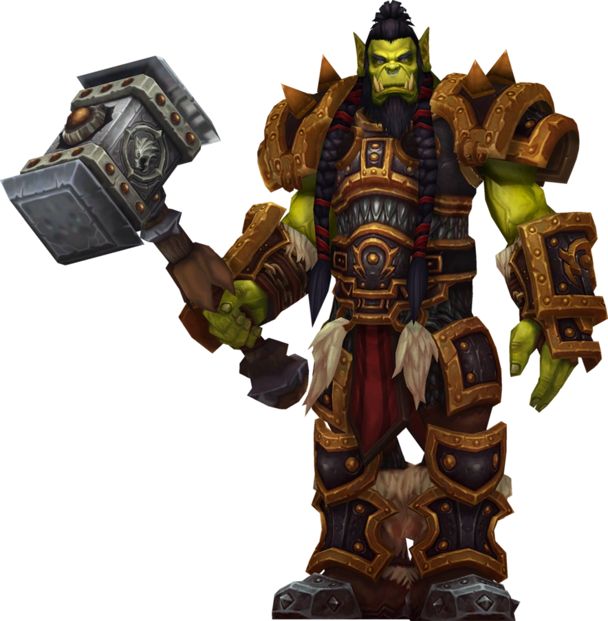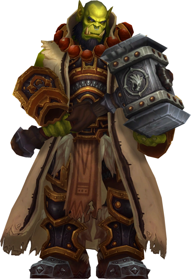 Thrall (birthname Go'el), son of Durotan (born the year 0 ADP),[2] was the Warchief of the restored orcish Horde and ruler of the red land of Durotar in Kalimdor. Before the Cataclysm, he was Warchief of all the Horde, but temporarily gave leadership to Garrosh Hellscream[3] in order to lead the Earthen Ring's effort with Farseer Nobundo against the Twilight's Hammer cult and elemental imbalance afflicting Azeroth caused by the awakening of Deathwing.[4] After Garrosh's tyranny was overthrown, Thrall renounced his claim on the title of Warchief and instead gave the position to his close friend and ally, Vol'jin.