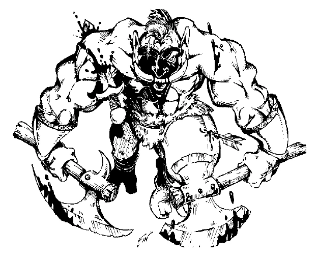 Troll berserkers are a bloodthirsty sect of trolls dedicated to the total annihilation of their hated enemies, the elves. Suffering numerous experiments with strange chemicals and potions by the goblin alchemists, the berserkers have had many strange abilities bestowed upon them that make them all but unstoppable in the heat of battle. Berserkers are hardier and stronger than most trolls, effectively transforming them into a veritable whirling cyclone of death and destruction.[1]