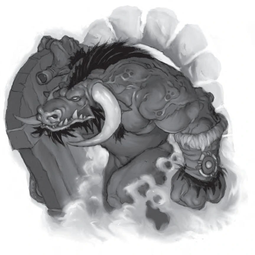 A tauren runemaster and fel-sworn, Umber Goonrock is Dak'mal's right-hand tauren. He is a tauren, but enormous and misshapen. The creature is forced to stoop to maneuver through the corridors, and his massive bulk is like a wall. Patches of red, scaly skin mark his black-furred hide. His black horns curve downward, and they are long and twisted, fading to red at their tips. Runes glitter across his body.[1]