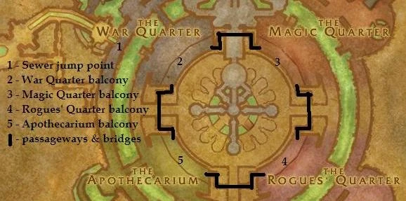 Balconies above the inner circle parts of the War Quarter, Mage Quarter, Rogues' Quarter, and Apothecarium can be seen while flying in and out of the city by taxi. These empty balconies, aside from a single food crate, are on the same level as the Trade Quarter and are connected by footbridges that span above the corridors leading to and from the Trade Quarter and the outer quarters. These balconies and their connecting bridges can actually be seen on the map of Undercity. They cannot be reached on foot, but a mage can use Slow Fall, a priest can use Levitate, and an Engineer can use a Parachute Cloak to reach these balconies. From the top of the sewer tunnel where vampire bats pass, a player can activate either any one of these, mount up, run and jump, aiming to the left of the tunnel, to land on the balconies above the War Quarter. Video of how to reach them.