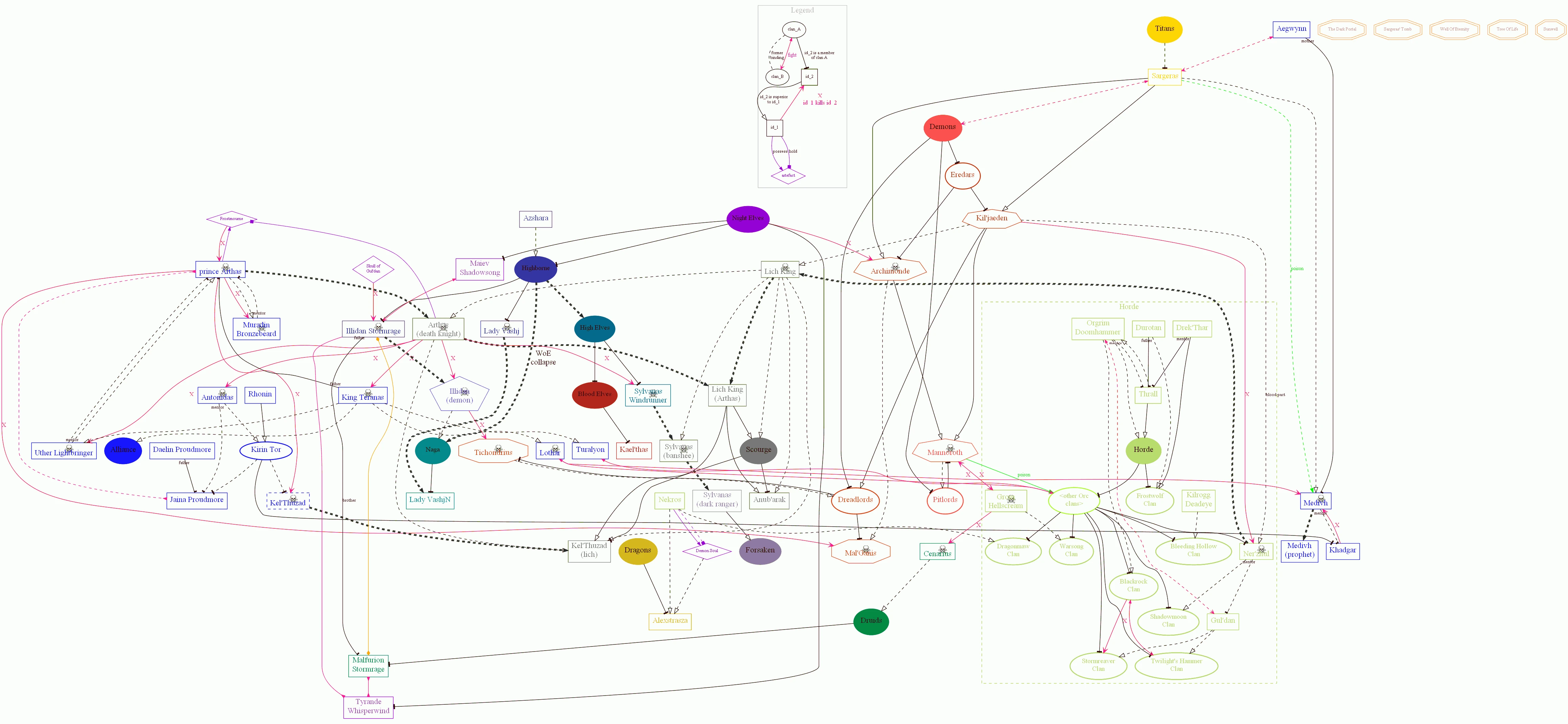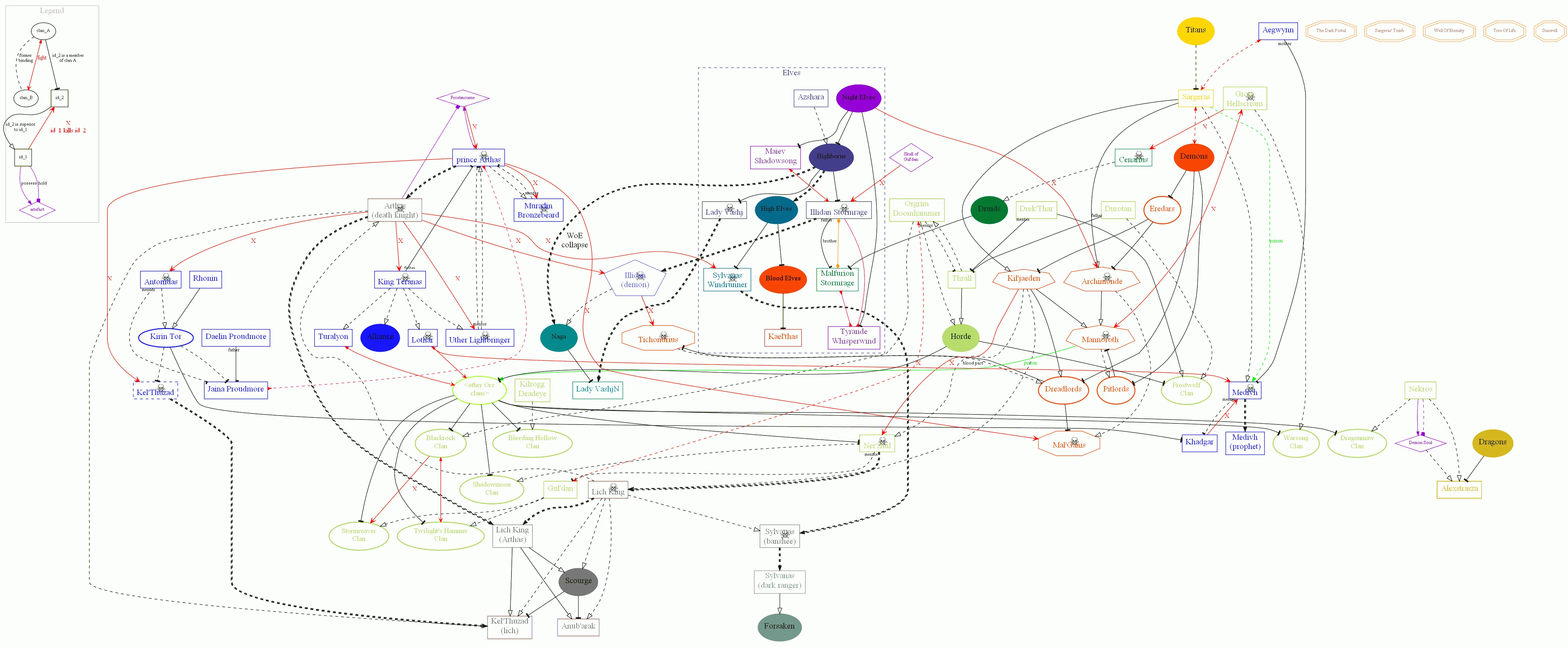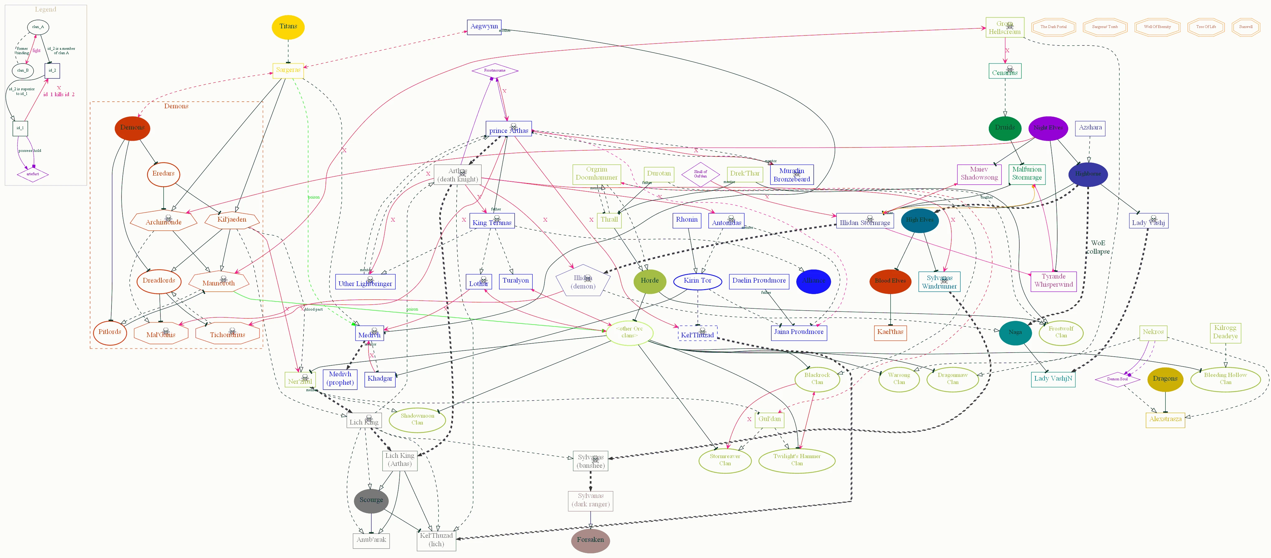 The Warcraft relations map is a map of relations between most important characters, clans and artifacts until the end of The Frozen Throne storyline. In some cases (e.g. Arthas, Illidan), relations between characters are so complicated, that might be useful to see it in a graphic form - that's why this project was created.