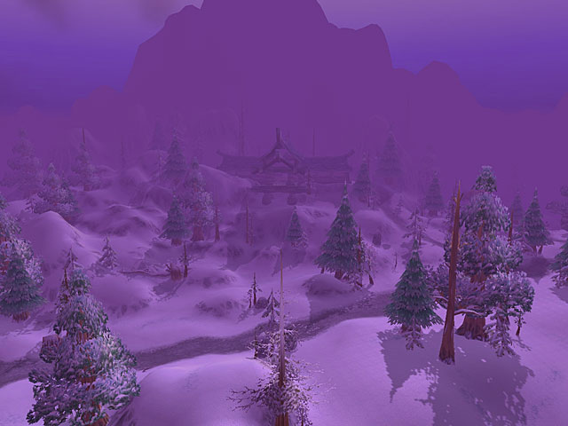 Winterspring Valley is above Moonglade and is the last stop along the road that winds up to Hyjal Peak. The valley is separated from Moonglade, lower on the mountain slope, by a thick, white cloud bank. Winterspring is a cold realm consistently covered with snow and frost. Once above the clouds, the air is crisp and clean and the sun shines often when the snow is not falling. The trees of Winterspring were bent and twisted into odd positions during the climactic Battle of Mount Hyjal. Many of the World Tree's massive roots are also exposed here, towering overhead like massive oak archways. This otherwise cold and serene place shakes with periodic conflict between the forces of the sorcerer-dragon Cobaltann and the night elves who strive to drive them from the slopes of Mount Hyjal. Snow cats, bears, and other creatures of the wild are seen here on occasion, but only rarely due to the high altitude. It is a place of cold medium forest and rugged mountains.[1]
