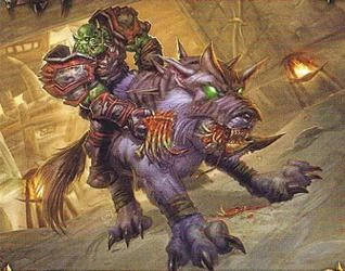 Long ago, the orcs tamed the large and swift wolves of Draenor. These massive canines came to be the orcs’ chosen companions as well as their favored method of transportation. The wolves’ unflinching temperament made them especially well-suited for battling large prey. When the orcs became more warlike and invaded Azeroth, their wolves were bred for size and stamina so they could bear armored riders into battle. Dire wolves remain the favored mounts for orc fighters and can be purchased in the Valley of Honor in Orgrimmar.[2]