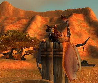 A wyvern is a wolfish-lion with bat wings and a scorpion tail. They can be found living in the harsh cliff-terraces of the Barrens, Stonetalon Mountains, and the Thousand Needles. They hold great enmity for harpies, as the vile creatures like to capture young wyverns for food and to subvert and train as guardians.[2]