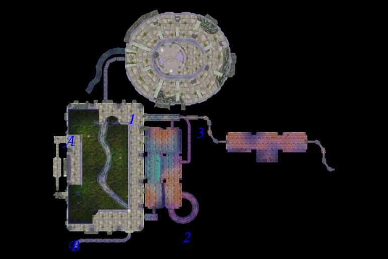 Enter Dire Maul East either through the main entrance (A) or the side entrance (B). Follow the path to the northeast corner (1). Turn right into the entrance of a passageway. Turn right again at the fork in the passageway (1B). Head south through the room, towards the southeast corner. Take the circular ramp (2) downwards. Head north through the room, towards the northeast corner. Take the ramp (3) upwards. Zevrim will be on the platform you exit the ramp onto, on your left.