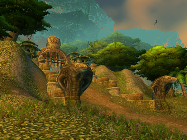 Zul'Gurub was a 20-man raid instance located in northeastern Stranglethorn Vale, released in patch 1.7. Like Zul'Farrak, it counts as an outdoors zone, and riding on mounts is possible. Zul'Gurub is the capital of the jungle troll tribes, led by the Gurubashi, worshippers of the terrible god, Hakkar the Soulflayer, who personally inhabits a temple in the deepest parts of the city. It is believed that Zul'Farrak was once an outpost of this kingdom but was lost in the Sundering.